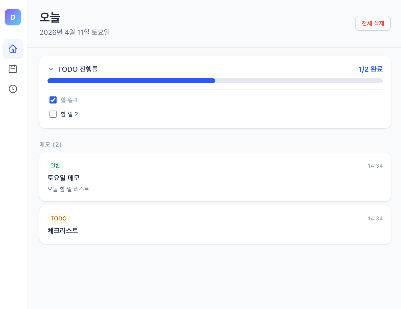 1편에서 Claude가 제안했다고 언급했던 기능이다. 앱을 켜면 오늘 날짜의 메모와 TODO가 한눈에 보이는 대시보드가 뜬다. 핀 고정한 메모가 위에 오고, TODO 진행률이 프로그레스 바로 표시된다. "노션을 열면 캘린더만 덩그러니 보인다"는 불편함이 이걸로 해결됐다.
