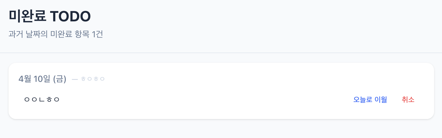 "오늘로 이월"을 누르면 오늘 TODO 목록에 복사되고, 필요 없으면 "취소"로 지울 수 있다. 이게 노션에서 해결 못했던 "어제 TODO 뭐였더라?" 문제를 완전히 해결해 줬다.