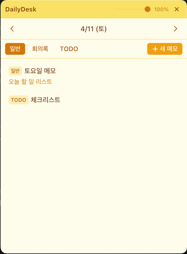 이름은 DailyDesk로 지었다. 매일 책상에 앉아서 여는 메모장 같은 느낌을 주고 싶었다.