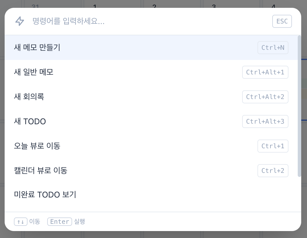 Cmd+K를 누르면 커맨드 팔레트가 뜬다. 메모 생성, 뷰 전환, 검색 진입 같은 동작을 키보드로 빠르게 실행할 수 있다. VSCode에서 익숙한 그 느낌이다.